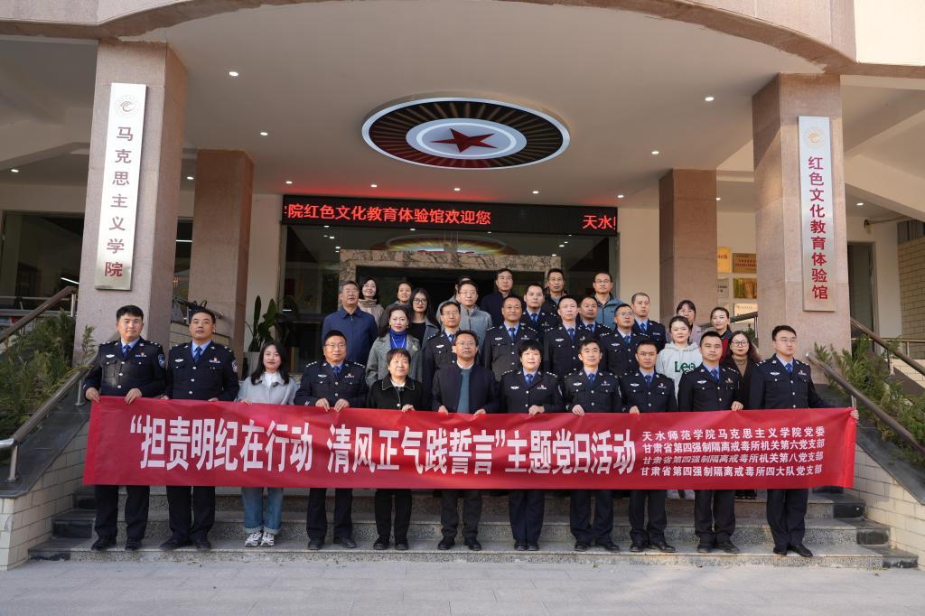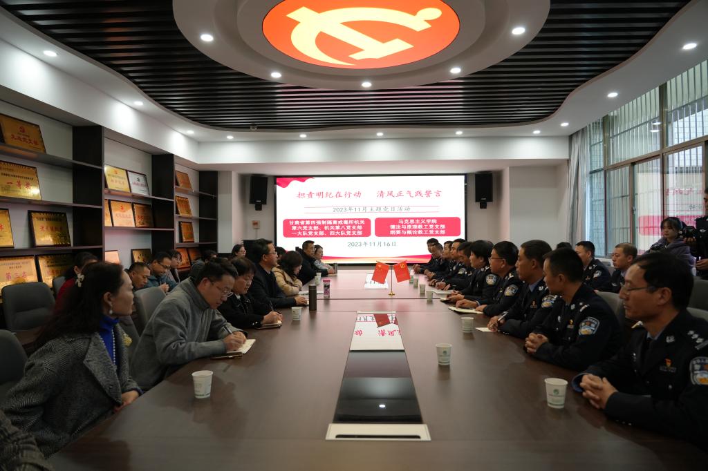 为深入贯彻党的二十大精神,推进“三抓三促”行动走深走实,增强党支部和党员教师不忘初心、实干担当、奋发有为的自觉性、主动性,多措并举推进党风廉政建设,11月16日下午,学院德法与原理教工党支部、纲要与概论教工党支部联合甘肃省第四强制戒毒所机关第六党支部、机关第八党支部、一大队党支部、四大队党支部共同举办的“担责明纪在行动 清风正气践誓言”主题党日活动在学院党建办公室隆重举行。