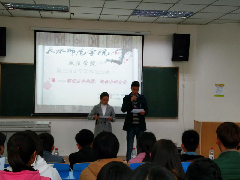2016年11月5日上午,政法学院第三届文学学术交流会于我校7号教学楼301教室隆重举行。本次学术交流会由政法学院《求实学刊》编辑部主办,邀请甘肃机电职业技术学院学院、甘肃林业职业技术学院、甘肃省工职业技术学院相关文学学术社团与政法学院当代马克思主义研究会参会。此次活动由我校政法学院《求实学刊》编辑部主编高俊发、副主编林梦菲策划,以“铭记古今先烈,传承中华文化”为主题,通过PPT演讲、诗歌朗诵、脱稿演讲与自由讨论等多种形式展开,旨在激起当代大学生的爱国主义热情,弘扬中华民族精神,传承优秀传统文化。
