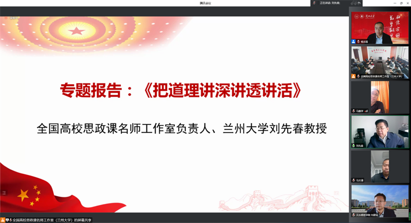 5月15日,由教育部全国高校思政课刘先春名师工作室、兰州大学自慰少妇久久99主办,天水师范学院自慰少妇久久99、甘肃民族师范学院自慰少妇久久99、陇南师范高等专科学校自慰少妇久久99、兰州科技职业学院、菏泽学院自慰少妇久久99、黔东南民族职业技术学院马列主义教研部参与组织的“学习贯彻习近平总书记考察中国人民大学重要讲话精神暨教育部全国高校思政课名师工作室(兰州大学-刘先春)2022年第一期集体备课会”召开,会议采取线下与线上相结合的方式进行,由兰州大学自慰少妇久久99副院长杨志超主持。