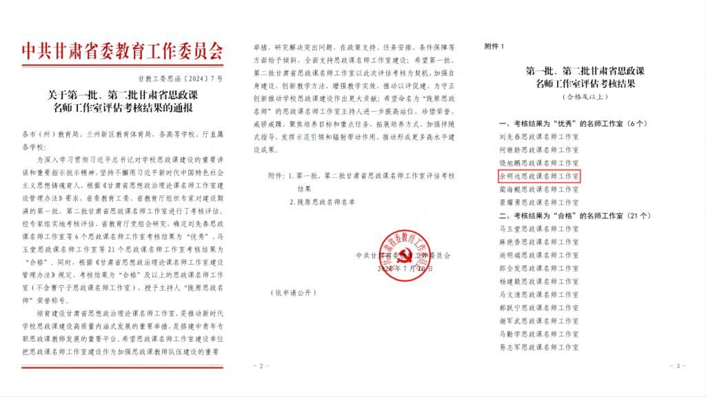 根据《甘肃省思想政治理论课名师工作室建设管理办法》要求,近期,省委教育工委、省教育厅组织专家对建设期满的第一批、第二批甘肃省思政课名师工作室进行了考核评估。