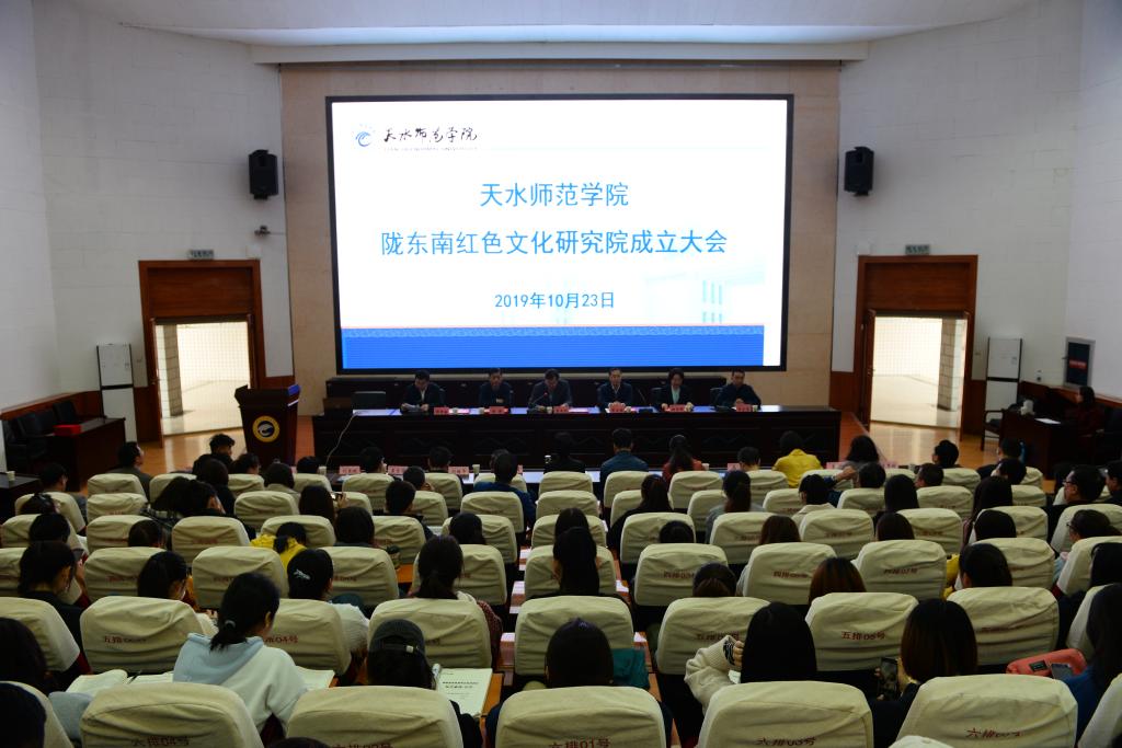 为深入贯彻党的十九大精神和习近平新时代中国特色社会主义思想,落实习近平总书记视察甘肃重要讲话精神,对陇东南红色文化进行系统研究,天水师范学院陇东南红色文化研究院成立大会暨第一届陇东南红色文化学术研讨会于10月23日在2号报告厅隆重召开。省教育厅高等教育处处长张发旺、天水市委宣传部副部长杨清明、校党委书记李正元、校长安涛、党委副书记师平安出席会议。来自中国延安干部学院、兰州大学、甘肃省委党校、两当兵变纪念馆、会宁红军长征胜利纪念馆、兰州八路军办事处纪念馆等单位及我院思政课教师、政治辅导员、学生代表近300人参加了会议。成立大会由校党委常委、副校长王文东主持。