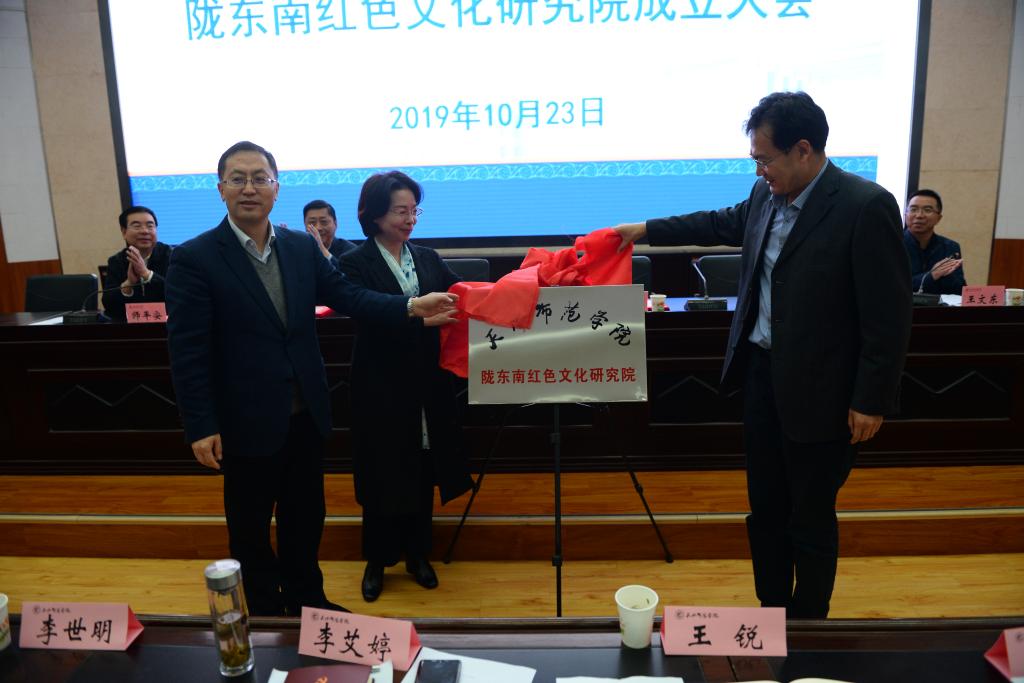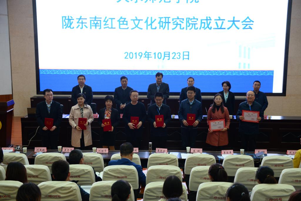 校党委常委、副书记师平安宣读了关于成立陇东南红色文化研究院的文件,党委书记李正元、省教育厅高等教育处处长张发旺、天水市委宣传部副部长杨清明共同为为陇东南红色文化研究院成立揭牌。会上为研究院的兼职研究员颁发了聘书。