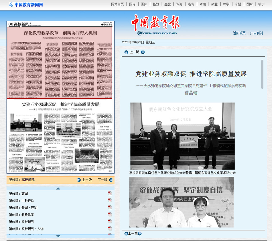 学院党总支以传承红色基因教育为指针,紧紧依托陇东南红色文化资源,做深做实红色党建。以天水师范学院陇东南红色文化研究院为载体,发挥红色文化育人功能,将红色文化研究与立德树人、思政课程、课程思政紧密结合。每学期组织一次陇东南红色文化课题调研和学术研讨,深入开展红色文化理论研究;以优化思政课程体系,编著地方特色红色教材为目标,组织编写了《红色文化在甘肃》七种系列学生辅学读本;积极开展红色文化宣传教育,举办了“传承红色文化弘扬红色精神”——学院思想政治理论课教师研学活动、红色文化进校园活动、红色文化专题讲座等。