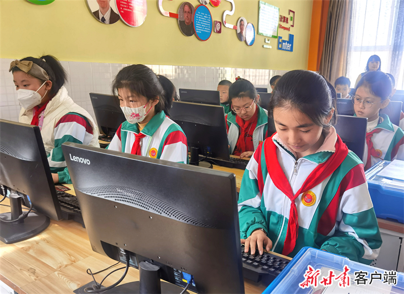 在陇南市徽县实验小学,六年级(9)班学生张冬寅和同学们正在创客教室参加创客教育兴趣小组,学习计算机编程、数据模块运用、人工智能等方面的知识。